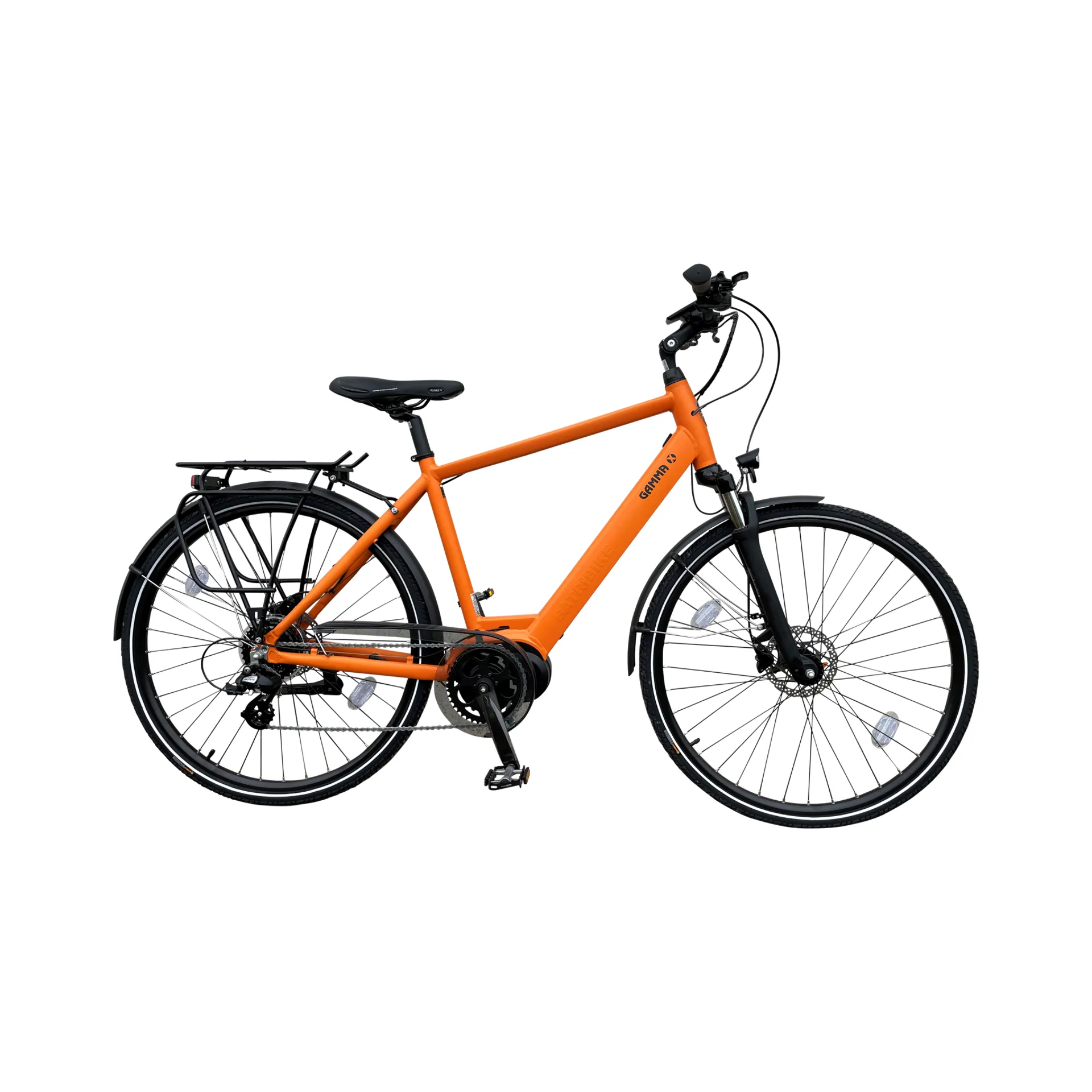 Orange Gamma crossbar e-bike with 100Nm mid motor, 10.4Ah 375Wh in-frame battery, and Shimano hydraulic disc brakes. Graphic display with multi-mode power delivery. 3-year battery and motor warranty.
